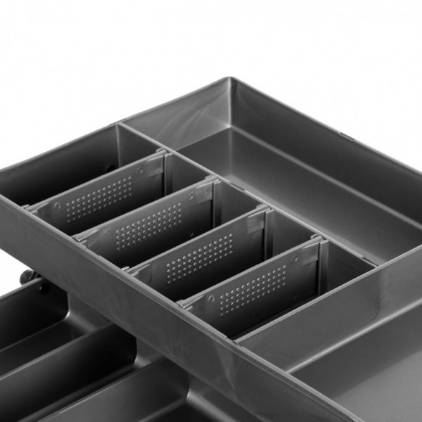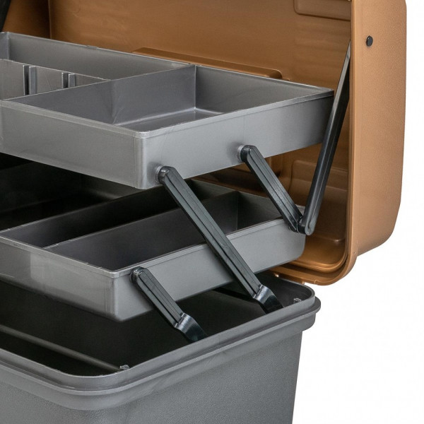 Удобный и вместительный ящик с двумя выдвижными полками для различной рыболовной оснастки: поплавков, приманок и другой полезной мелочи. На дно ящика можно положить 1-3 спиннинговых катушек.