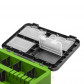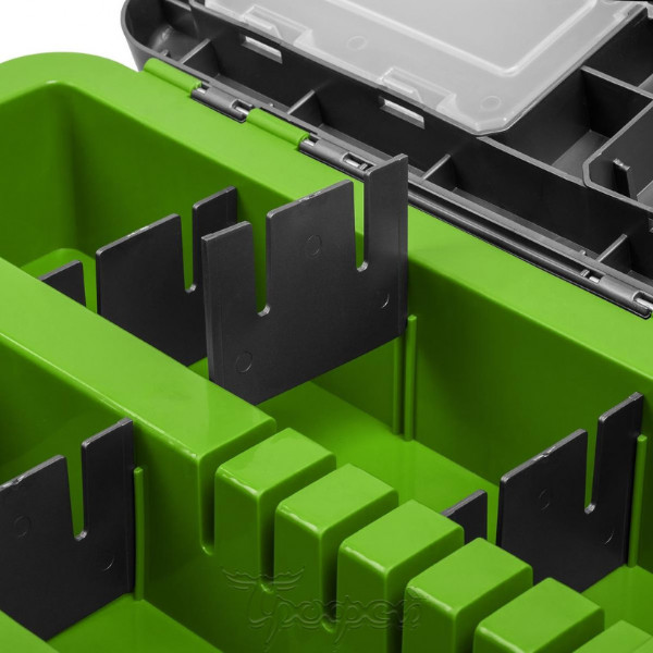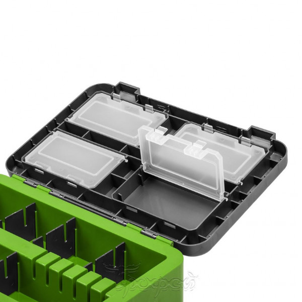 Основной отсек предназначен для переноски рыболовных снастей, термоса, так же удобен для перевозки улова. На внутренней стороне крышки размещены 4 отеделения с полупрозразчными крышечками для хранения мелких аксессуаров.