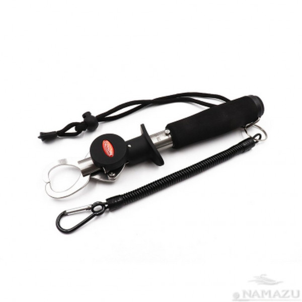 Захват челюстной Namazu N-FTS12 с весами и рулеткой. Позволяет извлечь рыбу, удерживая за нижнюю челюсть и не причиняя ей большого вреда. Для удобства использования, предусмотрен страховочный шнурок на запястье и ретривер с карабином для крепления на пояс.