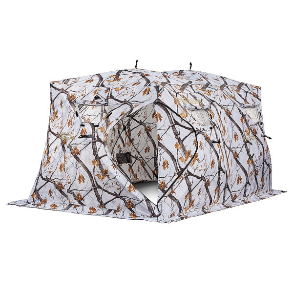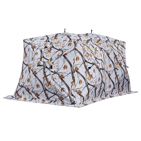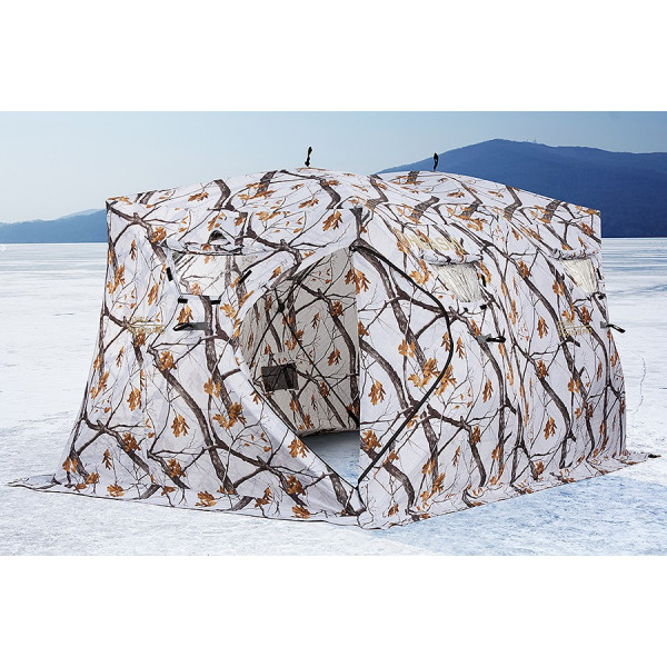 Сдвоенная утепленная трапециевидная зимняя палатка, выполненная в зимнем камуфляже. Каждая палатка оснащена шестью съемными смотровыми окнами, закрывающимися дополнительными тканевыми клапанами. Вентиляционные отверстия находятся под потолком и снабжены специальными клапанами. Палатка оснащена четырьмя сетчатыми карманами для хранения необходимых рыболовных аксессуаров. Обеспечение дополнительной безопасности нахождения на льду в темное время суток достигается наличием светоотражающих элементов.