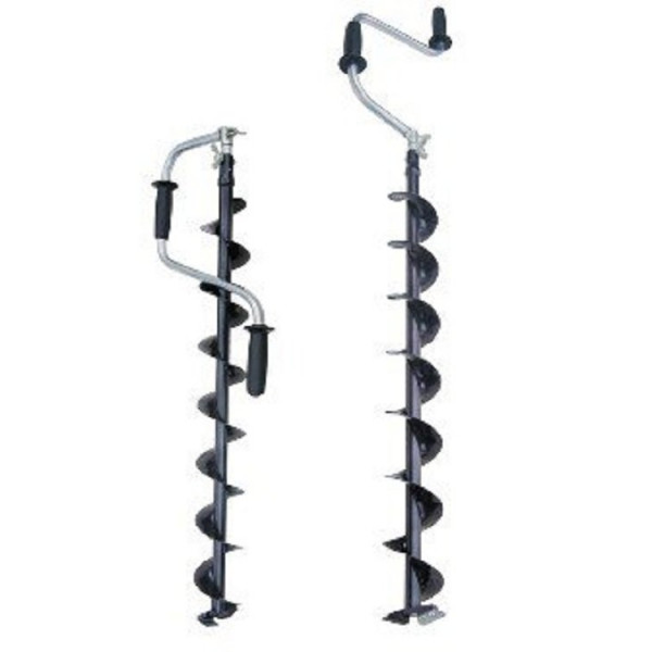 Верхняя рукоятка ледобура смещена относительно оси ледобура на 105 мм, а нижняя на 165 мм. Такое расположение рукояток позволяет вращать ледобур одновременно двумя руками, тем самым увеличивая скорость бурения лунок во льду.