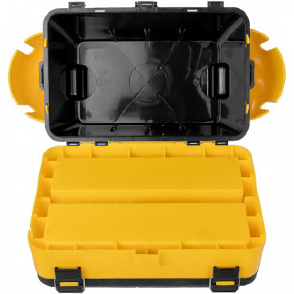 На внутренней стороне откидной крышки размещены 4 прозрачных закрывающихся бокса, в которых достаточно места для блесен, балансиров, рыболовных крючков, мормышек и прочих мелких снастей. Вставка-органайзер имеет две секции, где можно удобно разместить небольшие удочки. При необходимости эти секции можно разделить на более мелкие отделы с помощью съемных перегородок (5 шт). На дне ящика расположены специальные опорные ножки с противоскользящими зубцами. Удобные и надежные замки гарантируют плотное прилегание крышки к основному отсеку ящика. В комплекте идет регулируемый по длине плечевой ремень с наплечником, предотвращающим соскальзывание ящика с плеча во время движения.