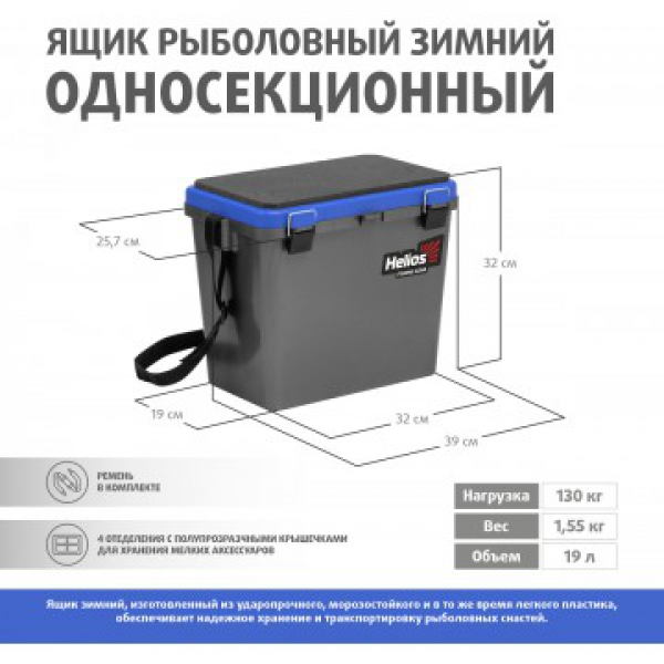 Ящик рыболовный зимний односекционный торговой марки Helios, изготовленный из ударопрочного, морозостойкого и в то же время легкого пластика, обеспечивает надежное хранение и транспортировку рыболовных снастей. Благодаря объему 19 литров, ящик вместит очень много полезных снастей для рыбалки.