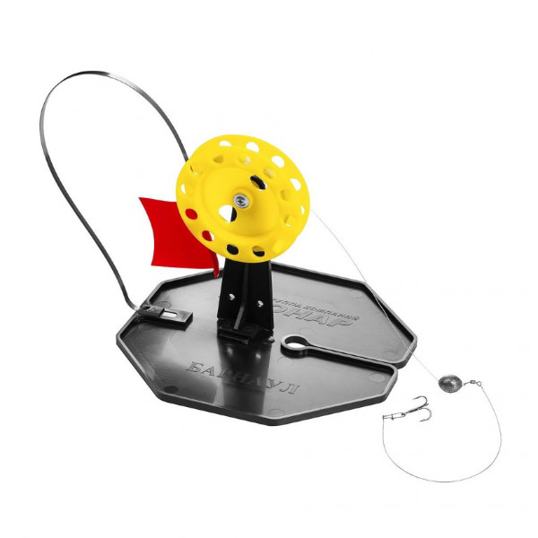 Жерлица зимняя для подледной ловли рыбы состоит из основания, стойки с катушкой и флажка-сигнализатора. Большое и прочное основание жерлицы из морозостойкого полипропилена гарантирует затемнение и защиту лунки от замерзания. Основание выполнено в виде восьмиугольника, что предотвращает проворачивание жерлицы в снегу. На основании находятся: прорезь для завода лески, паз под крепление стойки с катушкой, паз под крепление сигнализатора — флага.