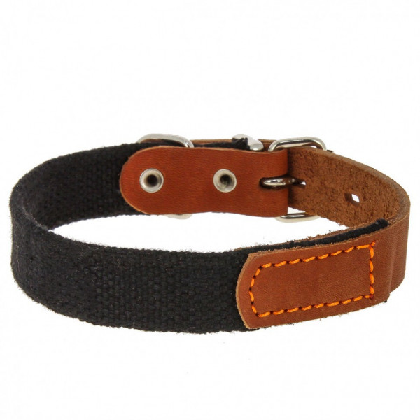 Этот ошейник изготовлен из прочной брезентовой стропы с использованием крепкой металлической фурнитуры. Ошейник отделан натуральной кожей.
