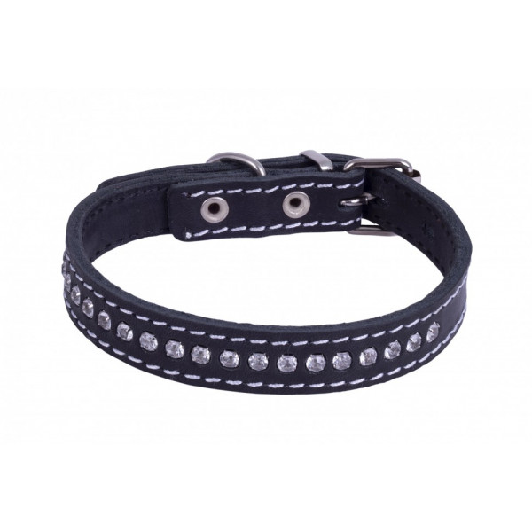 Этот стильный классический ошейник изготовлен из натуральной высококачественной кожи в 2 слоя с использованием крепкой металлической фурнитуры. По всему периметру ошейник украшен стразами.