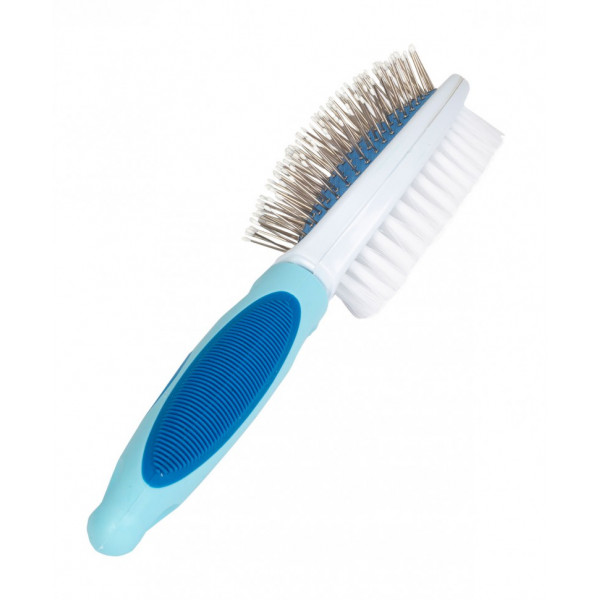 Удобная двусторонняя щетка (щетина и зубья) для животных с эргономичной прорезиненной ручкой. При расчесывании придает шерсти здоровый и красивый вид, удаляет старую шерсть и грязь.